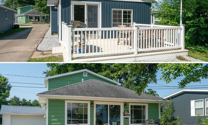 Discover the ultimate lakeside retreat with not one, but two beautifully refinished homes right on the shores of Gun Lake with a bonus garage room. Each home features 3 bedrooms, 2 full bathrooms, (totaling 6 bedrooms and 4 bathrooms) and a wealth of amenities to ensure a comfortable stay. Walking distance to Bay Pointe, Ice Cream, Gas Station and Pizza! Step outside to find a long dock with steps leading to the sandy and shallow swim area, perfect for a day of water activities. Two fire pits beckon for cozy evenings under the stars, while the expansive yard offers plenty of space for outdoor games. For added entertainment, a large garage awaits with a ping pong table, foosball table, shuffle board, tons of board games, game table and water games. With a long aluminum dock for your boat, the house also comes equipped with standup paddle boards, kayaks, and canoe available for use, as well as great fishing opportunities right off the dock, this property promises endless lakeside fun. Enjoy modern comforts like central AC, WIFI, Smart TVs, a roll away crib, pack & play, highchair, kids toys & games, fully stocked kitchen, all linens, and towels provided, washers & dryers, firewood, and gas grills for the ultimate vacation experience.