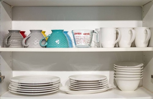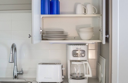 Fully equipped kitchenette with extra coffee maker, utensils and plates & bowls. Room includes a fully equipped bathroom, desk/breakfast table and pull out couch for 2 additional sleeping arrangements.