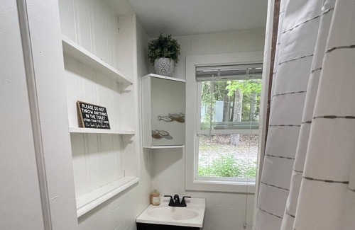 The Quaint Cottage comfortably sleeps 4 people. Open-concept living and kitchen space is fully equipped and includes a cozy dining area. The cottage is set back 20 ft from the Rustic Retreat and has a screened in porch overlooking the lake. The cottage has two cozy bedrooms and 1 bathroom. One bedroom with a memory foam queen bedroom and the second bedroom with two twin beds. Upgraded WiFi and flat screen (Roku and HD for streaming) and DVD player but no cable TV. There is also no washer/dryer but there’s a laundromat nearby.