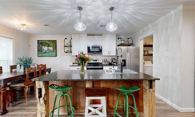 This home has been a true labor of love for my husband and me. We remodeled it with care, choosing quality furniture, solid wood and iron beds, and commissioning one-of-a-kind artwork to make it feel both welcoming and unique. As a big family ourselves, we designed the space to comfortably host larger families and groups who want to gather, relax, and feel at home at an affordable price point.