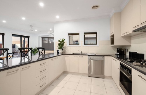 The large kitchen provides a perfect hub for entertaining with plenty of bench space featuring gas cooktop, electric oven and dishwasher.