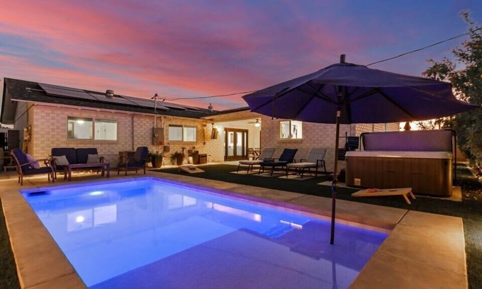 CROWN AZUL is a 4BR, 3BA Scottsdale retreat with two king suites, chic open living, and a private office. The chef’s kitchen features quartz counters, stainless appliances, and a coffee bar. Outdoors, enjoy a brand-new heated pool, spa, turf yard, al fresco dining, and covered lounge with TV. With elegant finishes, an oversized laundry, and stylish design, this home is ideal for families, groups, or professionals—just minutes from Old Town, golf, and dining.