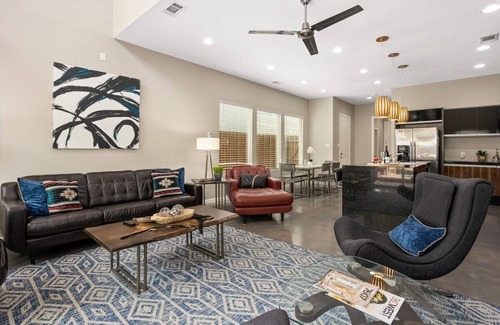 A beautifully decorated, spacious two-story townhome with modern amenities, located in the heart of the Cultural District of Fort Worth. The townhome features an upstairs master bedroom with a king-size bed, a large smart TV, a private bathroom with a jack-and-jill vanity, and a large walk-in shower. There are two additional upstairs bedrooms with a shared bathroom to comfortably sleep six adults. The property is located within a short walk of Dickies Arena and numerous other attractions!