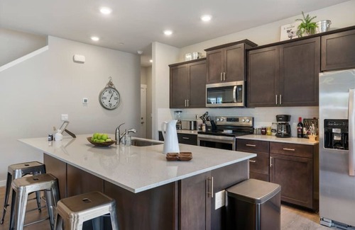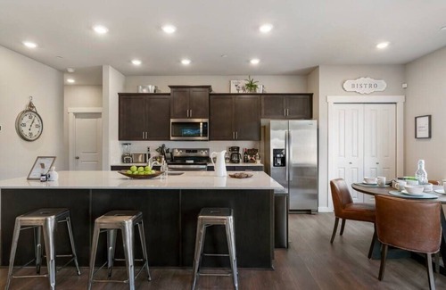 You've found the perfect vacation home for your big family, 2 mins to the Cattle Barn Venue. Our newly constructed vacation home has breathtaking mountain views and serene surroundings to make you feel refreshed and rejuvenated. Our beautifully designed living room features a cozy electric fireplace with a stunning white mantel, while our chef-inspired kitchen features a massive center island and top-of-the-line stainless steel appliances.