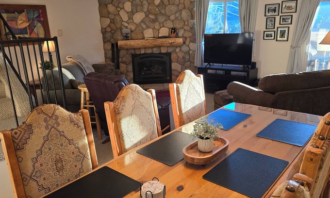 At 1134 square feet of living space, this is one of the larger 2 bedrooms for rent you will find. The split-level floor plan with the 2 bedrooms and a bathroom upstairs, also provides privacy and a homey feeling. This is our vacation home, and we furnished it with new, comfortable, and upscale furniture, including a Queen-sized Lazy Boy sleeper sofa, leather recliner and pillow-top Queen-size mattresses. The floor to ceiling stone gas fireplace provides both beauty and warmth.