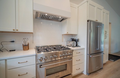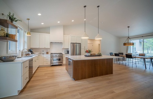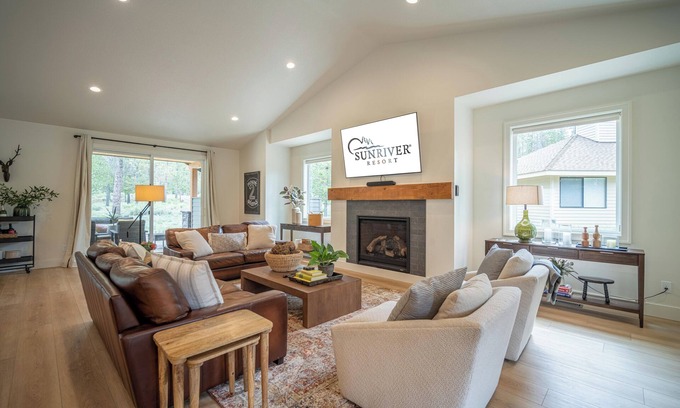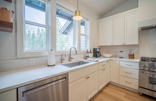 Located on the North side of Sunriver, just steps from the Sunriver Marketplace, this brand new home boasts a great room with gas fireplace, comfortable seating, oversized dining table with plenty of room for your crew, and double patio doors that lead to a spacious covered and uncovered patio. The kitchen features a 36" range, wine and beverage fridge and 2 dishwashers!