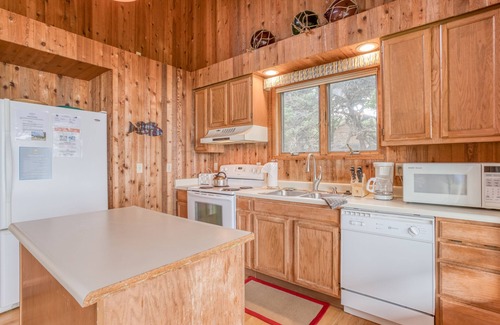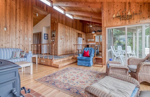 The kitchen and dining area are great for entertaining, and the living room is a small step down from the rest of the home, hosts a wood stove, and has a slider out to a large covered deck, which can be great when there is the weather here! The primary bedroom is quite large and has a wonderful soaking tub in the bathroom. The guest bedroom is on the opposite of home, next to the guest bathroom for privacy. Wonderful for two couples, family, romantic vacation! Some of our regular guests have been returning here for over 16 yrs! It is definitely a favorite!