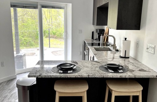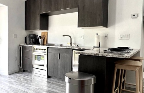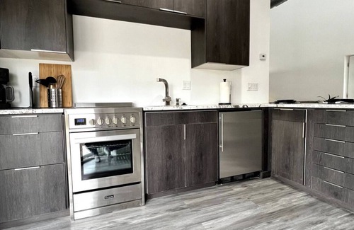 The living room has a sofa with a TV and DVD Player to relax and unwind after a day of exploring! This opens to the kitchen with counter height bar seating and a "tiny house living" concept. There is a mini fridge, stovetop, oven, and a wine cooler. The cabinets are stocked with pots, pans, cooking utensils, a toaster, coffee maker, and basic kitchenware.