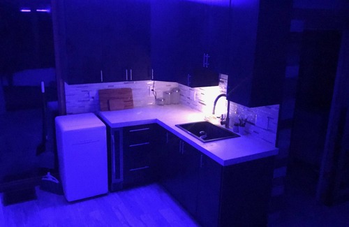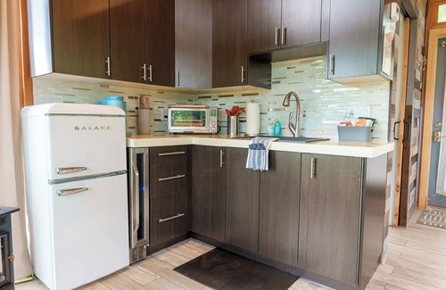 Tiny home = tiny kitchen! Our small but well-equipped kitchenette has two hot plates, pots, pans, a mini fridge and freezer, griddle, toaster oven, classic toaster, Keurig coffee maker, and all the utensils you need. There's even a 6-bottle wine cooler and an electric grill on the deck for outdoor cooking. While we don't have a traditional oven, microwave, or dishwasher, most guests still manage to prepare delicious meals without a hitch!