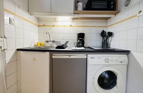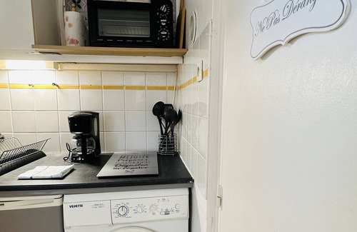 An open kitchen will make the living room very functional. This space is small in size but its full equipment will allow you to concoct delicious recipes. It is composed of storage units, a refrigerator, induction hobs, a microwave, an oven, a filter coffee machine, a toaster, a raclette machine, a cooker -steamer, a pressure cooker, a washing machine and kitchen essentials for the 1st night only (1 garbage bag, 1 sponge, 1 small bottle of dishwashing liquid, and a kitchen towel) will be at your disposal (except kitchen groceries: salt, pepper, oil ..) which will not be provided.