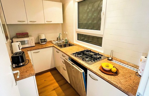 The kitchen is equipped with a stovetop, a refrigerator, and a dishwasher, as well as a coffee maker, a microwave, and cookware. And because there's access to laundry facilities, you can go a bit lighter on your packing.