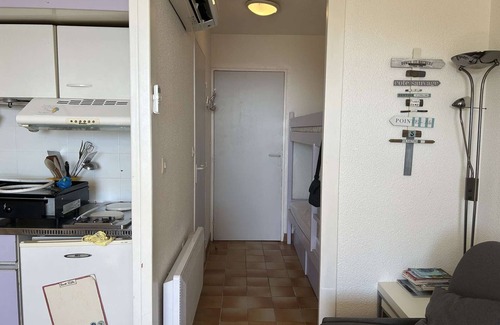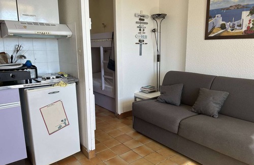 Cet appartement de vacances de type 2 se compose d'une chambre avec 1 lit double, un coin cabine avec 2 lits simples superposés, une salle d'eau avec WC; un séjour avec une cuisine ouverte équipée, une petite terrasse.