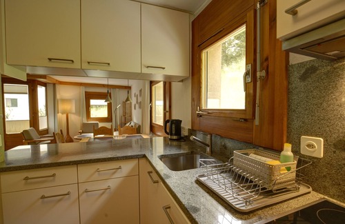 2-room flat on the 4th floor, 75 m2. Balcony, south facing position, with mountain view. Entrance with wardrobe. Bright, cosy living/dining room with 2 wall cupboard beds (90x200). Double room with double bed, bath/WC/lavabo, separate guest toilet. Radio, TV and telephone. Free WLAN connection. Open kitchen with oven and dishwasher. Nespresso coffee machine. Fondue and raclette can be borrowed free of charge at the reception. Garage space available for a fee (Fr. 5.-- per day in summer and Fr. 8.-- per day in winter). Ski and boot room for shared use. Non-smoking flat.