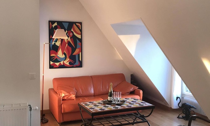 Exposed beams, very quiet on the top floor of the building (with elevator) and bright (7 windows).