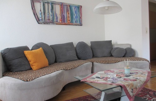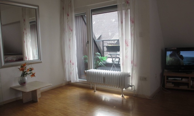 The apartment is located on the south-west corner of Rotteckring and Friedrichsring. It is only a few steps away from the direct pedestrian zone. It is quiet, bright, tastefully decorated and has a bay window with a side view of Fahnenbergplatz. The apartment is located on the 1st floor of a 3-storey building and is equipped with a comfort bathroom (shower / toilet) hair dryer, a kitchenette with 2 ceramic hobs and fridge with freezer compartment, coffee machine and microwave, an attractive dining area, a relaxation couch and cable TV and Radio with CD player. Own parking spaces can be rented 7 € / day.