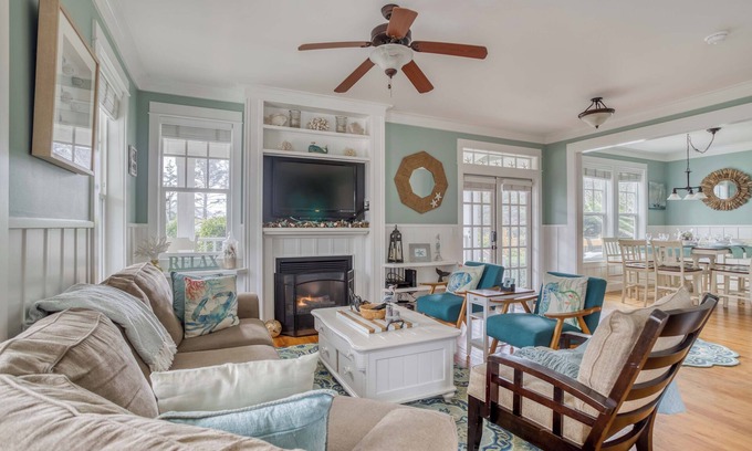 The sweet wrap-around porch suggests that relaxation is coming your way at the Cape-Cod-inspired Karen’s Cottage in the nostalgic neighborhood of Olivia Beach. Located just around the corner from the neighborhood park, with a lawn, playground, fire pit, and volleyball area, this home also grants you access to the community’s seasonal salt-water pool and fitness room. A stairway to the beach access is also in easy reach. You’ll love the soothing light aqua and white beach décor throughout this lovely home, with warm hardwood floors, old-fashioned wainscoting, high ceilings, and contemporary furnishings. A cozy arrangement of plush seating in the living room will invite your guests to gather around the TV and gas fireplace. A breakfast bar at a quartz counter adds extra seats to the elevated table for eight in the dining room. You’ll love cooking in the kitchen, which sports a gas range and a walk-in pantry for all your supplies. A barbecue on the back deck gives you the option of grilling outdoors.