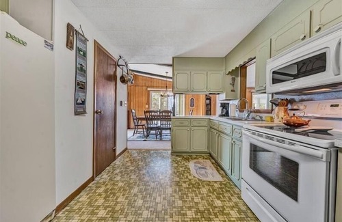 Kitchen with full size range, refrigerator with ice maker, pantry, crockpot, auto drip coffeemaker & breakfast bar. Sorry, no dishwasher. Dining area with seating for 6.