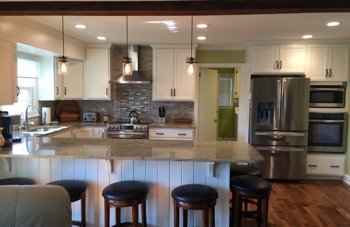 Serious cooks will love the kitchen. All new appliances! High-end, smooth top range with two ovens; an additional wall oven and matching microwave; large refrigerator in the kitchen and separate ice maker in utility room to insure plenty of ice for a large group on those hot summer days. You can seat up to 6 at the granite counter in the kitchen. It’s also a perfect place to prepare meals while you watch TV and converse with the family in the great room. Stand at the kitchen sink and wash dishes while you view the lake. You can also use the under counter dishwasher. Bring your whole coffee beans and use our grinder to make a superior cup of coffee in the 12-cup drip coffee maker. There is also a top-of-the-line Cuisinart SS-700 coffee maker that will use your K-cups (not the 2.0 K-cups). Large, 4-slice toaster will thaw and toast even your bagels. No old, beat up pots and pans in this kitchen; most of them are new and of high quality. The dishes and silverware are new, as well.