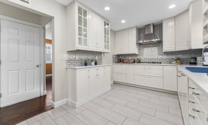 Our peaceful 6br features 2 kings, 4 queens, 4 full beds (sleeps 20) & just a 5 minute walk to the train & nearby strip with lots of local shops & restaurants.