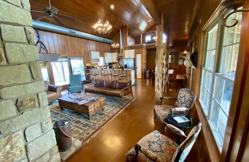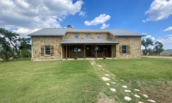 This certainly located family compound consists of a comfy 3 bedroom 2 bathroom home with a loft and fully stocked kitchen. Make this the launching point for the many hill country activities or chill out and enjoy the peace and quiet. There are 20+ mile views in all directions. The back porch is excellent for relaxing, wildlife watching and enjoying the view. There's a cozy 1 bedroom and 1 bath casita with a fold out sleeper sofa in the living room. There is also an air conditioned man cave/she shed we use for making sausage, watching TV and hanging out. Excellent internet connection via wifi tower on site. Traeger and Webber grills will meet your grilling needs. There are chickens and a garden to entertain and amuse. Two ponds offer excellent fishing and swimming but the depth will vary based on local weather trends. This ranch has miles of trails and dramatic hills and canyons to explore. It is like having your own persona state park. As part of this rental you are able to enjoy an OFF SITE private 3.5 acre deep water property with 515 feet of the Blanco river that is walking distance to the Blanco town square. There is a total of 3 Roku enabled TV's.