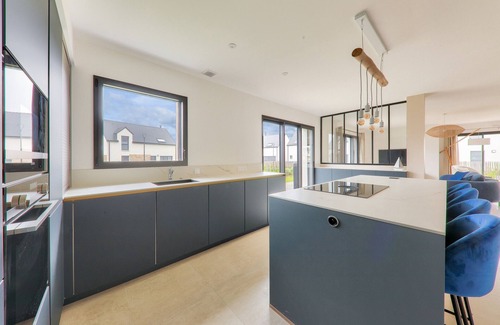 In the southwest of Vannes, close to the Quiberon peninsula, the port of La Trinité-sur-Mer and the famous menhirs of Carnac, lies the small commune of Saint-Philibert. A large 192m2 house, new with a lovely "seaside" decoration designed for 10 people (3 couples and 4 children for example) awaits you for beautiful family or friends holidays. You will have the pleasure of staying just 5 minutes walk from the first beach, a true privilege to refresh yourself this summer.Surrounded by a semi-enclosed garden and a beautiful 36 m² wooden terrace, the exterior is suitable for outdoor games and convivial meals prepared on the large gas plancha. And to relax in the sun, you will find six deck chairs.The ground floor consists of a large living space with careful decoration. There is a new open-plan kitchen, arranged around a beautiful central island, allowing everyone to participate in preparing delicious little dishes. Very well equipped, you will find an induction hob, a refrigerator, a freezer, a traditional oven and a microwave oven. For your breakfasts, a toaster, a kettle and two coffee makers (filter and Nespresso pod) are at your disposal.To savour the fruits of your culinary efforts, the dining room is furnished with a large wooden table and armchairs, where everyone can take a seat.To relax or enjoy a good film, the TV lounge with its large sofas and armchairs invites you to settle in comfortably.A beautiful master suite, with its Queen size bed (160/200), paddle decor, a desk and a private bathroom with a large Italian shower, completes the ground floor.The sleeping area continues upstairs, with two "adult" rooms with Queen size beds (160/200). The first, with its driftwood headboard, has a large wardrobe, the second with its turquoise colour and soft rug also offers a small desk.The last room is certainly the most important, as it can accommodate 6 children! With its 4 bunk bed spaces and 2 trundle beds, it is the dream dormitory to play, tell stories, chat far too late and create magnificent holiday memories.To avoid waiting for the shower, two bathrooms and a bathroom with an Italian shower are also located at this level.For added comfort, the house has 2 independent toilets, a hairdryer in each bathroom, a washing machine and tumble dryer, as well as a private outdoor parking space. You can also bring your bikes and store them in the garage.Ideally located, the rental is:- 200 m from the "Men er Bellec" beach- 850m from Kernevest beach- 1km from the Océane nautical club (Kernevest beach)- 2 km from the "Proxi Super" supermarket- 2 km from St Philibert town centre and its shops- 2 km from the "Le Kasha" restaurant- 6 km from La Trinité sur Mer, its port, restaurants and shops- 8 km from the Locmariaquer megalithic site- 8 km from the "Géant du Manio"- 9 km from the "Tumulus St Michel"- 9 km from the Menec Alignments - Carnac- 10 km from the Le P'tit Délire leisure park- 14 km from the Forêt Adrénaline Carnac - Treetop park- 14 km from Auray station- 15 km from the "Bluegreen St Laurent" Golf domainThis charming seaside town of the Gulf of Morbihan shines with its 17th-century Chapel, whose ceiling is covered with stars, located on the riverbank. Nearby, the Men Er Beleg and Kernevest beaches will delight oyster lovers.Once invigorated, dive into the unique atmosphere of the megalithic sites! In the neighbouring moorland, 3,000 menhirs align over hundreds of metres, forming a fascinating spectacle.This rental benefits from a concierge service with a team available throughout the stay for personalised services.This accommodation has Wi-Fi access.This rental does not have access for people with reduced mobility.Animals are not accepted in this rental.The tourist tax is added to the rental amount and must