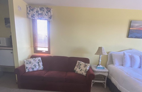 Located TWO miles from downtown, in the Stonecliffe neighborhood. This hotel room style unit has one queen bed and a sleeper sofa. This room also features a mini fridge, microwave, and coffee maker.