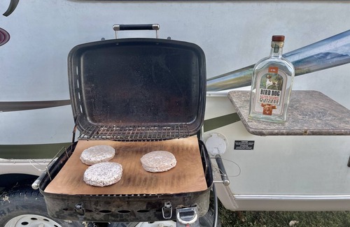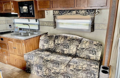 Kookie Kamper-1 slide out. Has all LED lights inside. Sleeps 6-8. Dining seating is U-shaped. It has an electric jack. Comes with a power awning, 2 heated mattresses, 2 full LP tanks. Has stove, fridge, freezer, and double kitchen sink. Shower, with toilet & sink. All bedding included. Has a outdoor shower, and an outdoor stove. Radio inside and outside. TV near queen master bed. 30amp power cord, sewer hose, water hose, spare tire, adjustable ball hitch with stabilizer bars. 6600lbs GVWR. We deliver/set up/ and pick up within 25 miles from our home for free, $100 for 26-50 miles max. Fresh Chocolate Chip cookies with every rental🍪 Renters are welcome to use the camper on our property as well. Camping on our property would include the use of our fire pit, grill, basketball court, patio, shower/bathroom nearby. The camper initially comes with a full water tank, full generator, and 1 full refill generator can. Both generator containers will need to be full upon pickup, or pay $25 if empty. We take care of the sewer free of charge upon pickup.