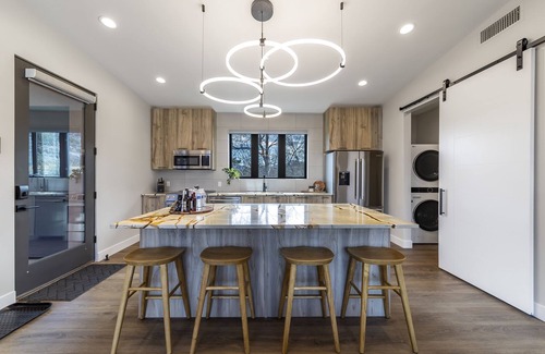 The Villa features a brand-new full-size kitchen with stainless steel Bosch appliances and granite countertops, plus a beautiful quartzite island bar.