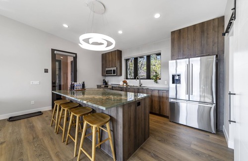 The home features a brand-new full-size kitchen with stainless steel Bosch appliances and granite countertops, plus a beautiful quartzite island bar.