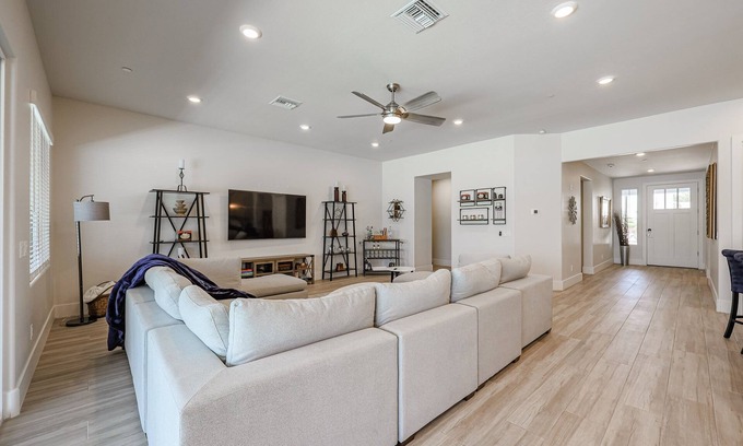 Welcome families, friends, bachelorettes & Barbies! Indulge & unwind in the tranquility of your serene private resort w/BOUGIE amenities galore - extra mirrors, outlets, lighting & seating. 2023 BUILT from scratch, (vs remodeled) this posh Old Town Scottsdale Oasis boasts modern extravagant conveniences, a smart floorplan w/10ft ceilings, THREE high efficiency HVAC units (3 t-stats), an oversized GARAGE & paved driveway parking. Cook w/new high-tech stainless appliances in fully-equipped Chef's entertainment kitchen. Relax on BAJA shelf in the sun or the shade (umbrella sleeve on the shelf) in the heated Pebblesheen (polished stones) April 2023-built pool. BBQ on 30ft shaded patio or hangout playing jumbo Jenga under the jumbo umbrella. Enjoy FOUR spacious bedrooms (TWO opulent MASTER SUITES) & FOUR Bathrooms (3 FULL baths &1 Powder Rm). With 5 bathroom sinks, 3 showers plus a separate tub, several guests can get ready in a jiffy. You will feel like a Hollywood celebrity decking out for a night on the town or that special event. The huge master closet has been converted to a "BARBIE GLAM ROOM" with multiple lights, mirrors, outlets & adjustable height chairs, perfect for the bride & multiple bridesmaids to get ready together. Up to15 guests will sleep comfortably on deluxe mattresses, including one SLEEP number with controls for two guests (master two) & one LUXURY king mattress (master one). Enjoy the convenience of an indoor Washer/Dryer w/laundry sink, allow you to save CA$H, travel lighter, skipping the checked bags. If you are traveling with a toddler or infant, leave the bassinet, crib, changing table & high-chair at home. Babies sleep wonderfully in the (no windows) MASTER closet, with TWO doors. One door connects to the interior laundry room, the other to the master bath. The (optional heat) pool is a welcome retreat promising hours of excitement and leisure. Located in the heart of Old Town Scottsdale, you have quick access to 5-Star eateries, world-famous SPAS, Spring Training baseball, countless Top Golf courses, Barret Jackson, the Phoenix Open, casinos, breweries, ASU, luxury shopping at Fashion Square, Camelview Luxury Theater, Desert Botanical Garden, Phoenix Zoo, Camelback Mountain hospitals, iFly skydiving, Octane Raceway, Tempe Town Lake & more!