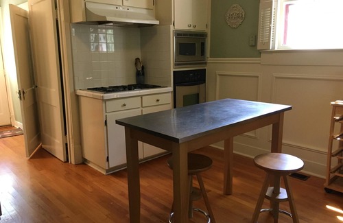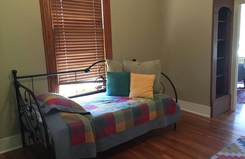All of the bedrooms are located on the second floor, but there is a queen sofa-sleeper and a full sofa sleeper on the first floor. Upstairs, one bedroom has twin beds, the master has a queen bed, and the other has a double bed and built-in office/workspace. An additional room upstairs off the master bedroom can be used as a dressing area, playroom or additional bedroom; it is furnished with a twin day bed and a trundle bed. This room does not have direct access from the hallway and can only be entered through the master bedroom or another bedroom. The office/workspace has a built-in workstation (computer not provided) and lots of natural light from the windows on three sides. Downstairs in the original living room (which can be easily closed off from the rest of the house) is a full sleeper sofa. In the main living area there is a queen sofa sleeper.