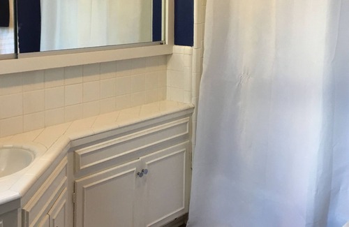 There is one bathroom upstairs and one bathroom downstairs. Each bathroom has a tub and shower. The bedrooms do not have private bathrooms. The bathrooms are not handicap accessible.