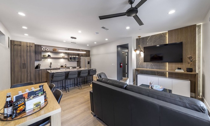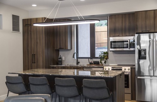 The villa features a brand new full-size kitchen with stainless steel Bosch appliances and granite countertops, plus a beautiful quartzite island bar.