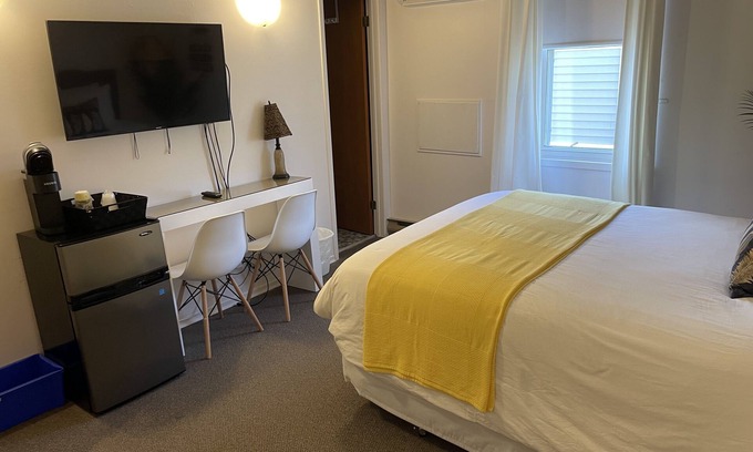 Located on second floor of building; this spacious room has one queen bed, extra pillows, smart 43" high def TV, cable, high speed internet, one large window w/ black out blind, desk w/ 2 chairs, bar fridge, Keurig coffee machine, private bath/shower, hair dryer & keyless personal key code entry. Enjoy access to guest common kitchen along with use of outdoor BBQ. Property has free parking, front deck with tiki hut, side and back patios with security cameras. No smoking, vaping or pets permitted