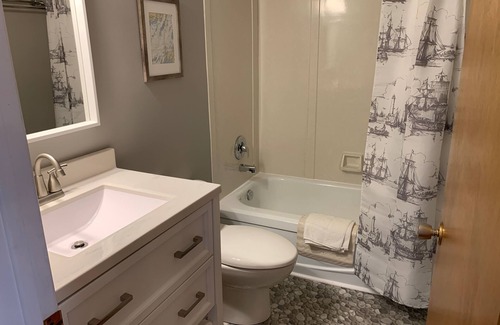 Located on second floor of building; this spacious room with view of Mill St. has 2 double beds, extra pillows, smart 43" high def TV, cable, high speed internet, 2 large windows w/ black out blinds, desk w/ 2 chairs, bar fridge, Keurig coffee machine, private bath/shower, hair dryer & keyless personal key code entry. Enjoy access to guest common kitchen along with use of outdoor BBQ. Property has free parking, front deck with tiki hut, side and back patios with security cameras. No smoking, vaping or pets permitted.