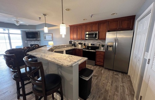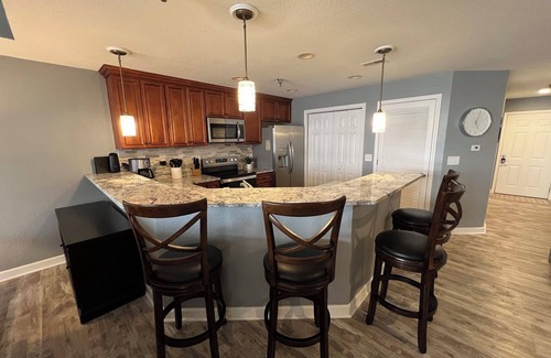 The kitchen is fully equipped and stocked very well, featuring granite countertops and stainless-steel appliances: refrigerator, dishwasher, microwave and stove with smooth cook top. The breakfast counter seats 6 and the dining table seats 4 making this great for family gatherings. An added plus is a wet bar for your afternoon/evening cocktails.