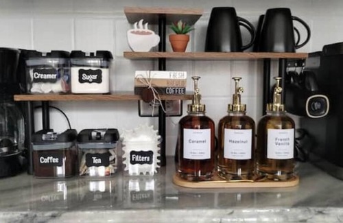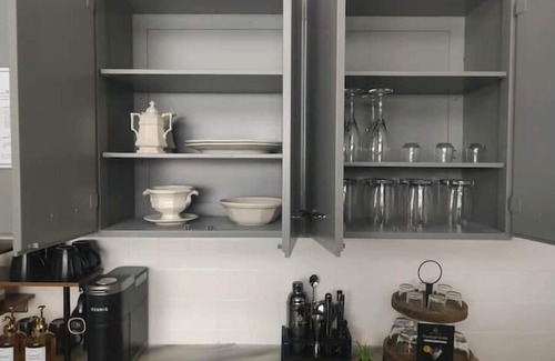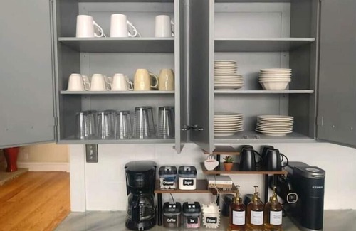 As you enter the home, walk up one flight of steps to a beautiful spacious kitchen stocked with all your cooking essentials and appliances (refrigerator, electric stove, dishwasher). The kitchen also contains a microwave, air fryer, mixer, Ninja bullet, blender,coffee bar, cocktail shaker set, dinnerware, flatware, cooking and baking essentials along with a spice rack and olive oil.