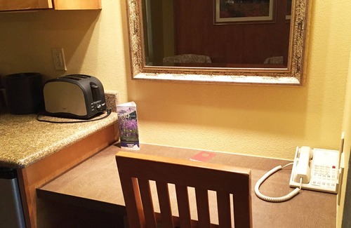 ✦ Kitchenette with small refrigerator, one-burner stove, microwave, dishwasher, Keurig-type coffee machine, toaster, crock pot, pots, pans, utensils