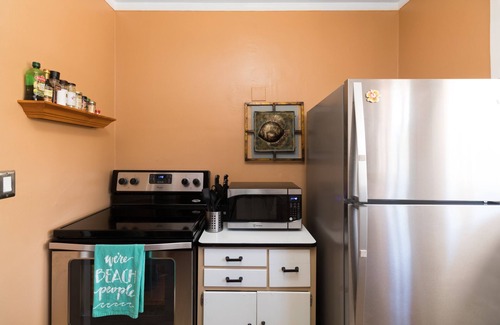Updated 1940's beach cottage with all the comforts of home! One of THREE cottages available (VRBO #501808, #621877 and 827904), FOR LONGER RESERVATIONS (28 nights+) PLEASE SEND A MESSAGE FOR RATES. Ground floor fourplex, Your private residence includes, WIFI, your own fenced-in and private, beautifully landscaped back yard with newly paved garden / dining area and Hammock / charcoal BBQ. Two private bedrooms, master with King bed accommodations and HDTV, second bedroom has 2 twin beds with 32' HDTV, and full size sofa bed in living area when necessary. All HDTV's include basic cable and Roku with Netflix subscription. Our cottage includes your own stacked washer and dryer, beach chairs and towels, Kitchen with oven/microwave and all the amenities of home! Charcoal grill for your outdoor barbecues, and Netflix subscription for those lazy nights inside! Your own private entrance, walk across the street to outdoor terrace dining! Rent a bicycle/surfboard/paddleboard on our block or take a surf lesson! Walk for coffee, breakfast, dining and entertainment on Cottage Row! Too many restaurants/coffee shops within walking distance to name, you can also enjoy a little of the Cocoa Beach nightlife without having to use your car! Located on A1A north, in the center of downtown Cottage Row district. Fully Licensed.