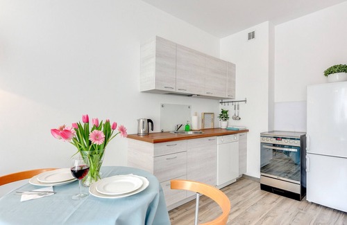 The apartment, featuring a double sofa bed and a double bed, can accommodate up to 4 people – perfect for a family stay! The space of 40m² is divided into a living room with a kitchenette, a bedroom, and a bathroom with a bathtub. The apartment also has a private balcony fitted with garden furniture. Overlooking a quiet, inner courtyard, the balcony is a great spot to enjoy a cup of coffee in the warm summer mornings or evenings. The interior is very bright and furnished in a cozy, homely style to make Guests feel at ease from the very first step into their accommodation. This homeliness is deepened by a range of essential amenities. Multimedia include a flat-screen TV and free Wi-Fi Internet connection. Kitchen and bathroom appliances (a dishwasher, a washing machine, an induction stove) increase self-sufficiency of our Guests. For a good beginning of every stay, complimentary toiletries, bed linen and towels are provided.