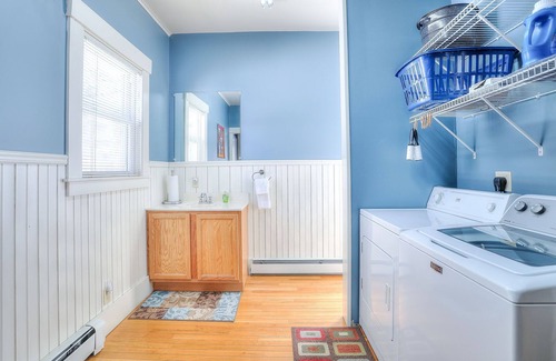 1/2 bathroom on Main floor with Washer/Dryer and ironing board and iron