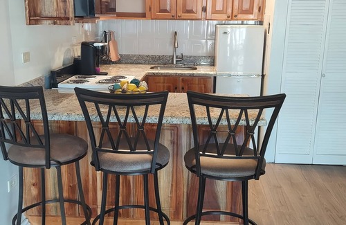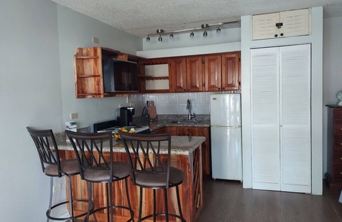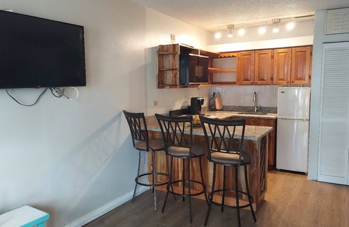 Quiet, close to waterfront, studio apartment, located about 4 miles from a major international airport. Apartment includes new microwave, refrigerator, iron with ironing board, cooking facilities and utensils, beautiful bathroom with a full tub, cleaning supplies, Queen sized bed. Apartment also includes a wall mounted flat screen television. in the back of the apartment there's a pool for adult and one for small children. in addition you can enjoy the view in the bay area where the cruise ship arrive on a regular