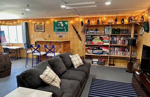 The garage bar/entertainment room features a handmade wooden bar with stools, a lounge area, second fridge, 55-inch smart TV, Blue ray DVD player with many DVDs, Nintendo Wii, PlayStation 4, Bluetooth speaker, AM/FM stereo, plenty of board games, playing cards, poker chips, books of all kinds, drawing supplies, and more!