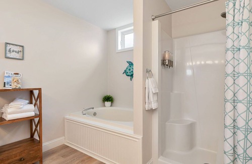 Waterfront Retreat’s second floor offers 1 full bathroom in the hallway, 2 spacious guest rooms and 1 huge master suite complete with walk in closet, full bathroom with jetted tub and separate shower, and a “nook” featuring a full-size sleeper sofa. All bedrooms have smart TVs set up for Netflix and YouTube tv. 1 guest room has a queen bed, the other has 1 set of full bunk beds, and the master has a king bed PLUS the “nook” with a sleeper sofa. The nook is a great space for more family members to sleep if you choose to share your master suite. Enjoy a cup of coffee from the coffee bar located in the master suite with complimentary coffee, sugar, and creamer. You don’t have to leave your room before having your first cup of coffee on the master balcony overlooking the bay with views of the Atlantic City Skyline and numerous wild birds to watch. Don’t worry, the other 2 guest rooms also have balconies! Those lucky guests get to wake up and sit on their large balcony overlooking the lagoon and watching the duck families dive for their morning breakfast!
