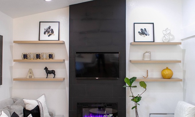 Living Room- This newly remodeled condo offers a high ceiling Living room with a beautiful space to lounge. It has two modern armchairs with a deep comfortable sofa right next to an electric fireplace and a Smart TV with access to Netflix, Hulu, Amazon Prime Video and more! High speed internet and WIFI included.