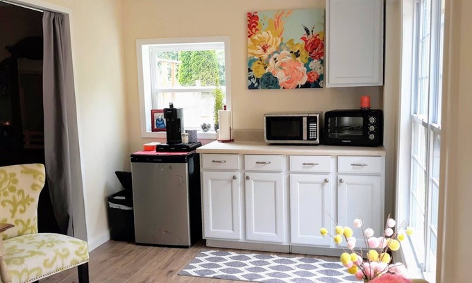 We are surrounded by great restaurants, but if you would like to cook, your kitchenette has all the things you need for you basic cooking needs! Microwave, countertop convection oven, countertop stove eye, griddle, toaster, K-Cup style coffeemaker, dishes, glassware, and cooking utensils will have you set! The dorm sized mini fridge has a small freezer with ice trays! We provide our guests with an assortment of coffees, creamers, sweeteners, teas, condiment packets (mayo, ketchup, mustard, hot sauce, and jelly's/jams), and a complementary goody basket! There is a small table with seating for two and a green sitting chair right in front of the picture window for drinking your morning coffee and watching the antics of our crazy dogs (free entertainment).