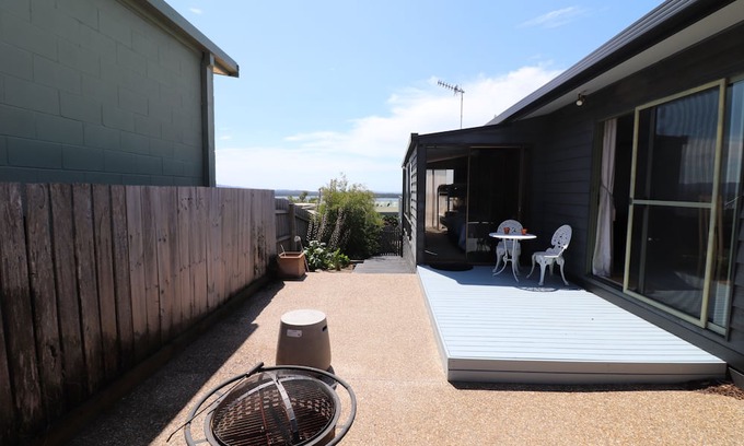 There is a large, east facing timber deck that opens up to an expansive view of Mallacoota and offers an outdoor entertainment and dining area. There is also a private, paved court yard to the side of the property with timber decking and fire pot (please review current, local fire restrictions that are in force at the time of your stay prior to using the fire pot).