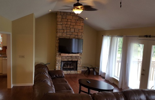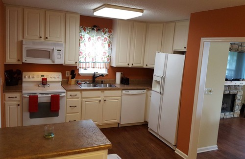 This 4 bedroom house is tucked away on a quiet dead end street. The additional lot next door is great for kids to play in or pets to roam on. The inside of the house was recently repainted and several updates were made. The main level has 2 large bedrooms both of which have their own bathrooms. The bedrooms each have a queens size bed and dresser with a large closet. The large living room has a brand new 55'' flat screen tv situated just above the gas log fireplace. The new sectional couch is large enough to accommodate 6-8 people comfortably. Also in the living room is a patio door leading onto the back deck. Half of the back deck is covered for those occasional rainy days. In the kitchen is a full sized refrigerator, microwave, coffee pot, a full size electric stove, and lots of cabinet space. The cabinets are furnished with the basics you will need for cooking. If you have a specific pan you will need for your cooking project I do recommend you bring one with you as we can not anticipate what everyone might be cooking. Hard plates, utensils, glassware, and paper towels are provided. You will need to bring your own paper plates and food storage containers. The kitchen table will is built to seat 6 with additional chairs stored in the garage for a larger group. Fold out tables are available by request.