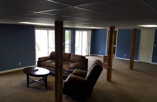 Located on the lower lever is a huge carpeted area perfect for playing games. There is also a huge couch with a large big screen tv. The 2 downstairs bedrooms are furnished with brand new queen sized mattresses and both have large closets. The half bath is located downstairs also. The basement has 2 patio doors that lead to the outdoor concrete patio.