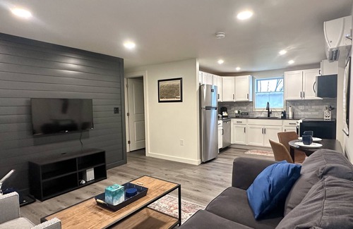 The Spruce features a yard and driveway for parking, along with onsite laundry facilities. Additional amenities include air conditioning, fast WiFi, a Roku Smart TV, and a DVD player. The rooms are well-lit with dimming options available in the living room and kitchen. Accent lamps are strategically placed throughout. For added convenience, extra bedding, blankets, pillows, towels, pots/pans, dishes, utensils, shower toiletries, and laundry/dish soap are provided
